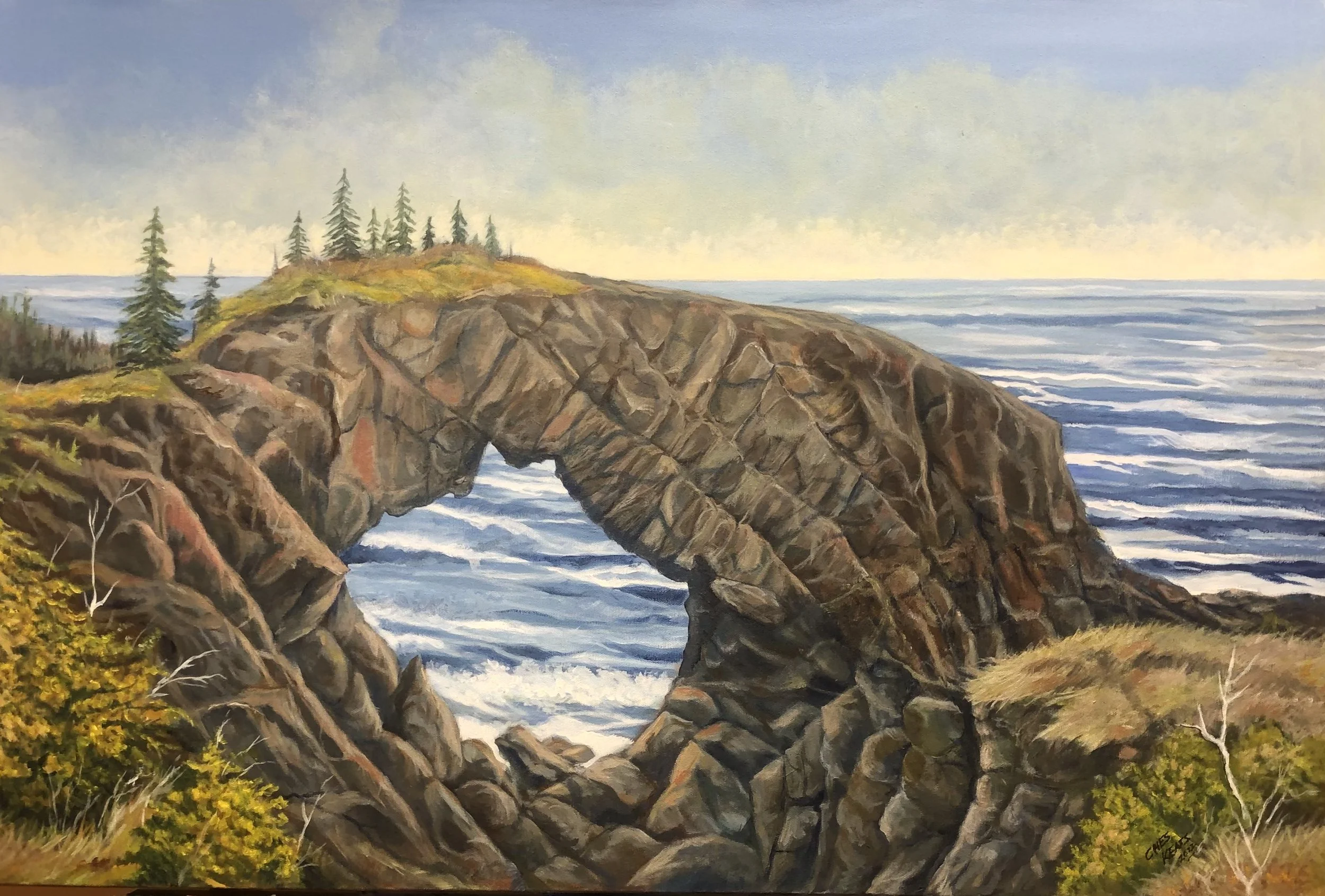 Description: This acrylic painting captures a remarkable view of the Berry Head Natural Sea Arch located on Newfoundland's East Coast Trail. Its unique shape portrays the result of centuries of erosion from wave and wind off the Atlantic Ocean.