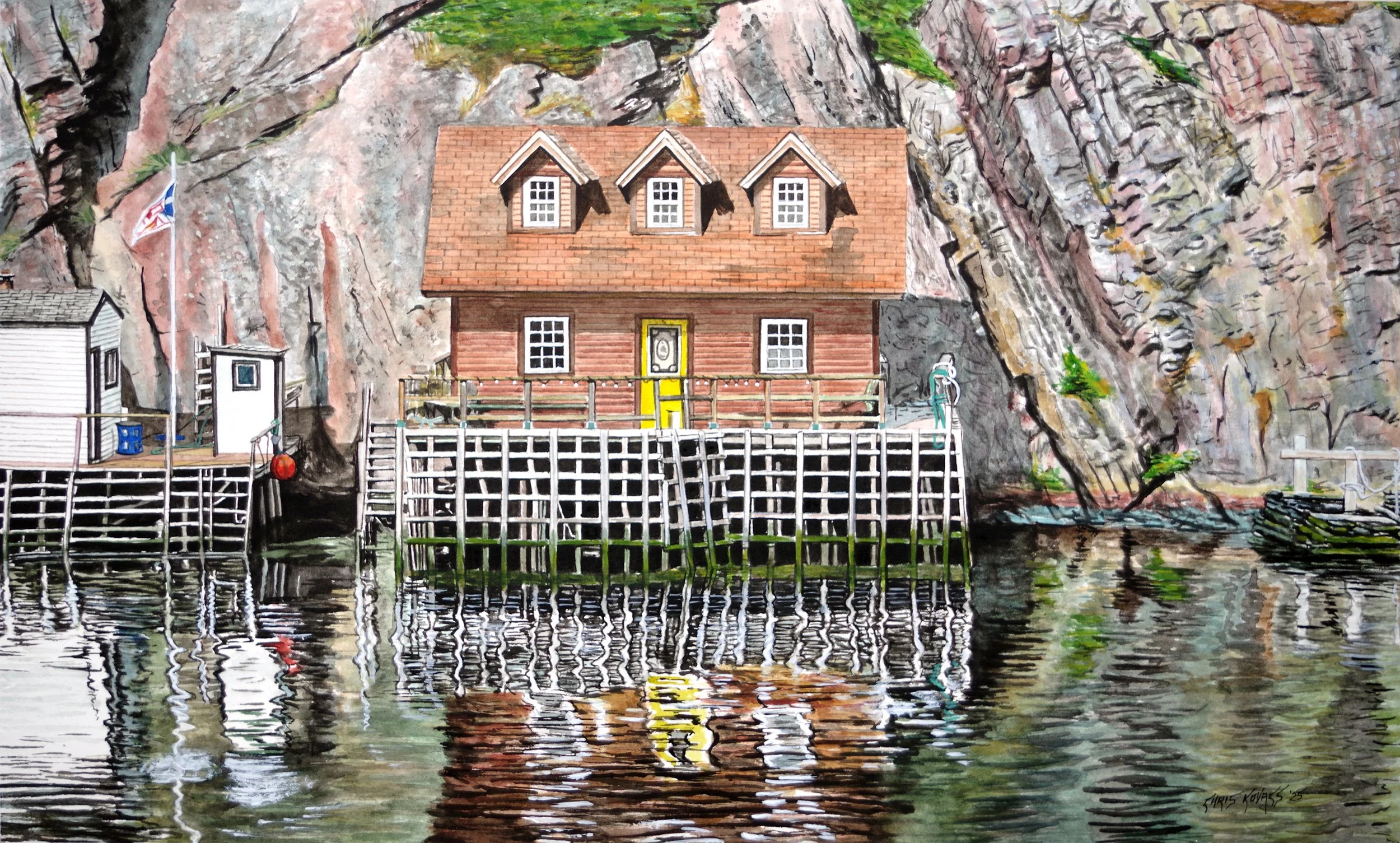 Description: This historic and colorful fishing stage, poised on the water of Quidi Vidi Gut and backed by a high cliff face, burned down just before midnight on July 29, 2025. Another to the right, with part of its wharf just visible in this image, also burned down. Although firefighters responded promptly, they had no access to these structures by road, and no ability to fight the fire from the water.
