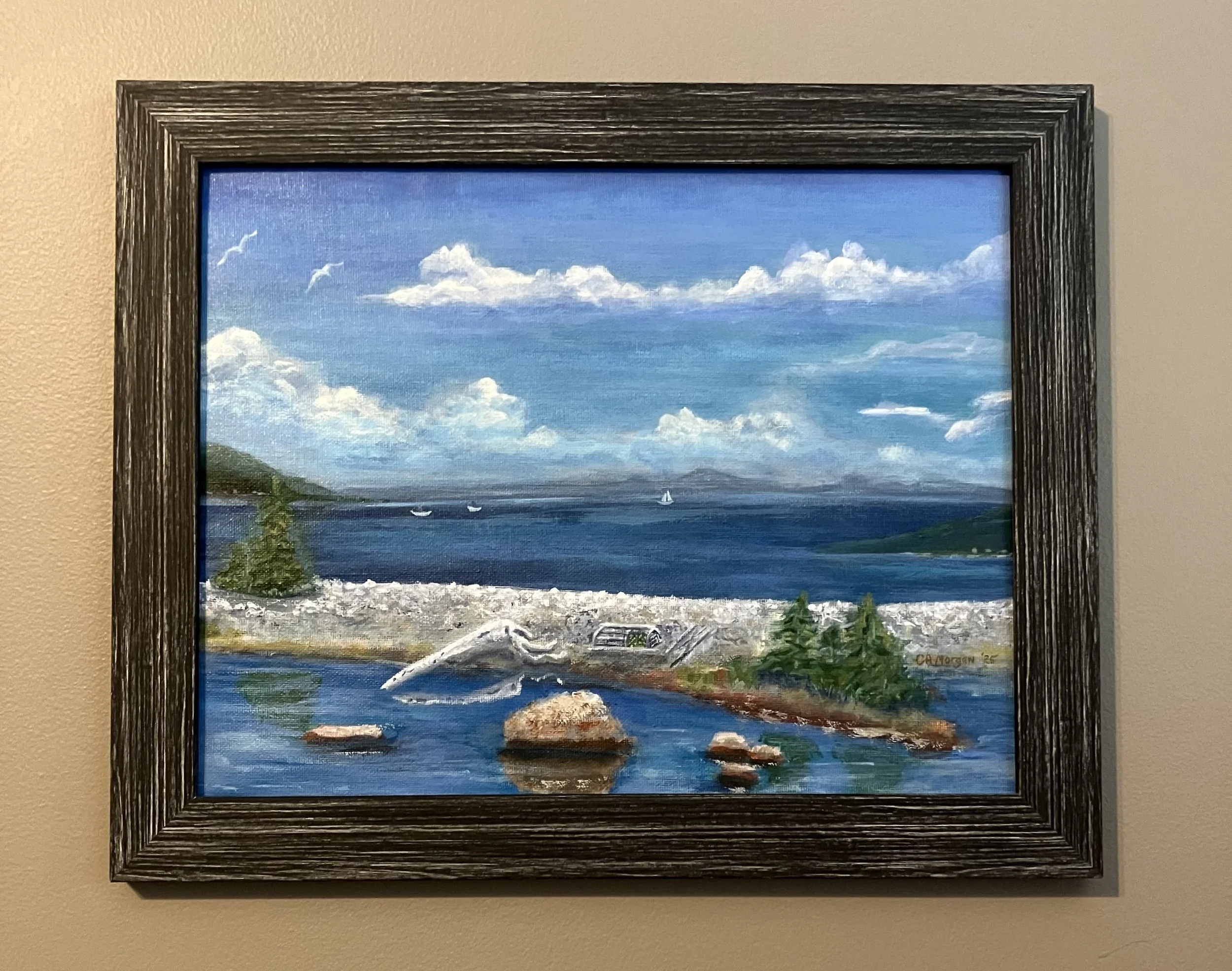 Description: This painting originated from attending a Plein Air session offered by AANL this year (2025) in the beautiful town of Hopeall. It is painted on an acrylic canvas sheet mounted on gesso primed canvas board and framed in a faux wood frame. Can be removed for other framing options.